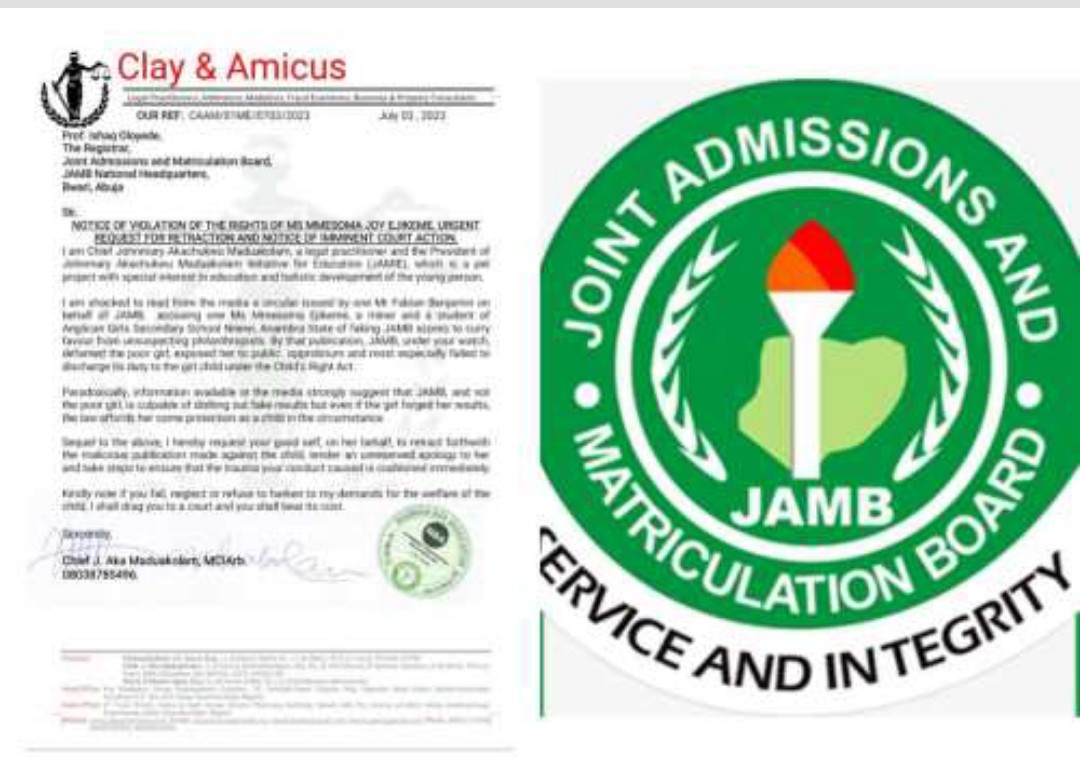 A lawyer, Johnmary Maduakolam, has threatened to file a lawsuit against Prof Ishaq Oloyede, Registrar of the Joint Admissions and Matriculation Board (JAMB), and the board’s management if they do not extend an apology to Mmesoma Ejikeme, within 24 hours.